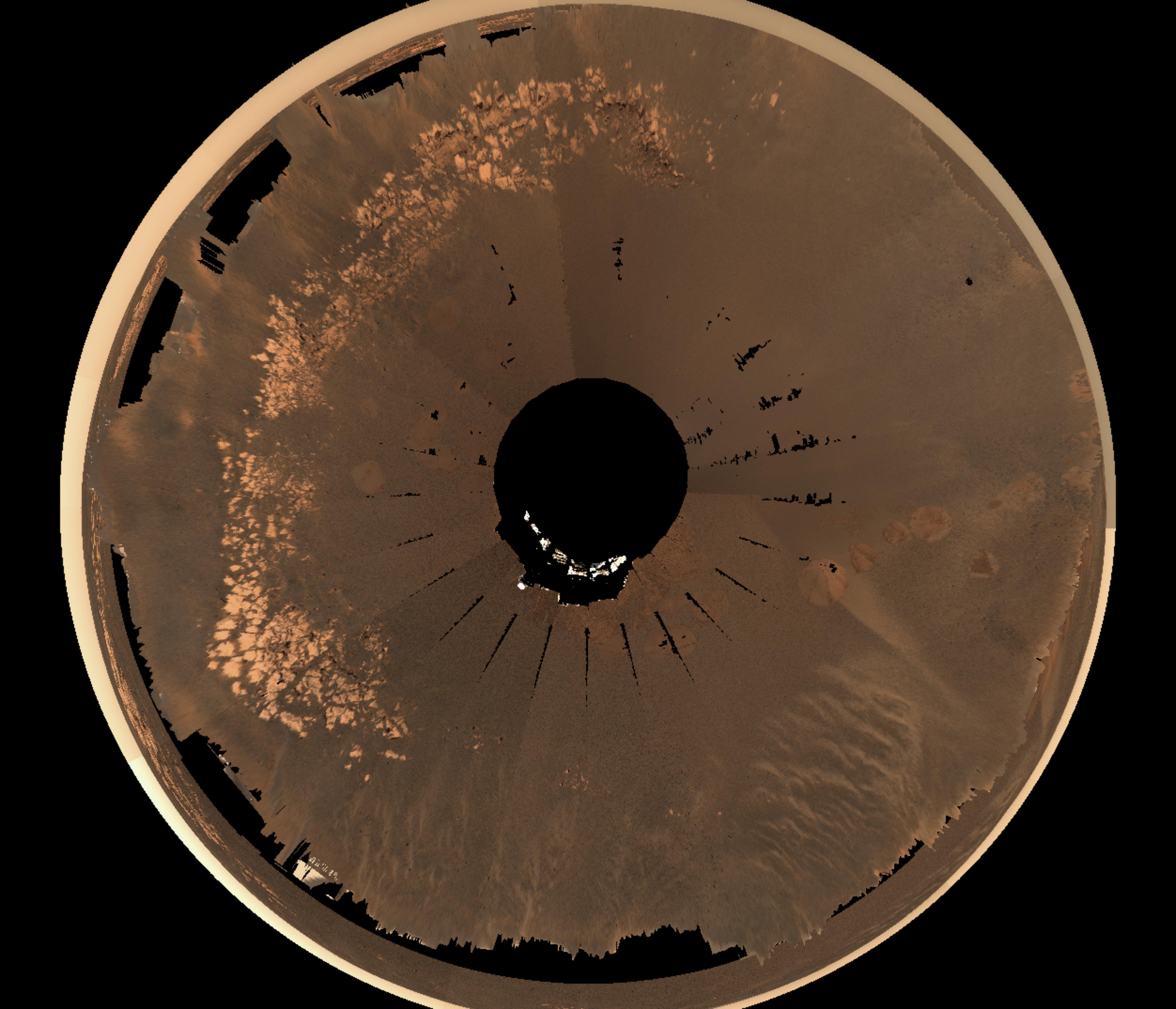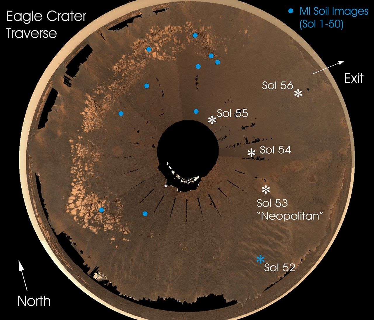 This image shows an overhead view of the Mars Exploration RoverOpportunity landing site at Meridiani Planum, nicknamed "EagleCrater." Scientists are conducting a soil survey here to see how thesoils in this crater relate to the soils near the Meridiani Planum rockoutcrop, as well as on the plains outside the crater. Scientists havestudied the soils in great detail on the north and west sides of thecrater, and plan to study five more locations before Opportunity exits thecrater. As of sol 54 of Opportunity's journey (March 18, 2004), the rover isstationed at the sol 53 stop, located in the bottom right quadrant of thisimage. Scientists are examining light and dark soil targets at this spot,dubbed "Neopolitan" because it is a triple boundary between light soil,dark soil, and an airbag bounce mark.