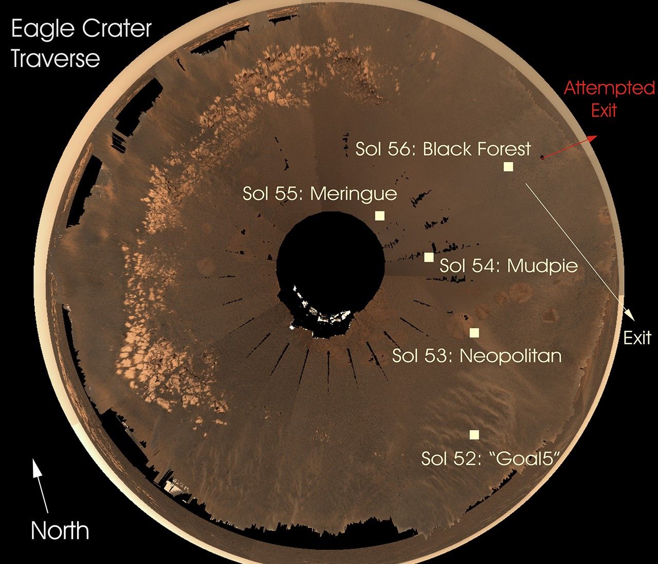 Scientists have studied five unique target soil patches on the south and east sides of the crater using the microscopic imager and Moessbauer spectrometer. "Goal 5" is a wind-rippled spot on the upper part of the crater, which the miniature thermal emission spectrometer shows is high in hematite content compared to other soils in the crater. "Neopolitan" lies on a triple boundary of a light soil unit, a dark soil unit and an airbag bounce mark. "Mudpie" was chosen to represent typical soils on the lower part of the crater that are relatively far from the outcrop. "Meringue" is a unique rippled area near the lander that features patches of "whitish" material in between the ripples. "Black Forest" is another upper crater soil unit but is low in hematite content based on data from the miniature thermal emission spectrometer. It also differs in appearance from the lower crater soils based on panoramic and navigation camera images. Arrows point to the area where Opportunity first attempted to exit the crater and the alternate route it ultimately took to reach the plains.