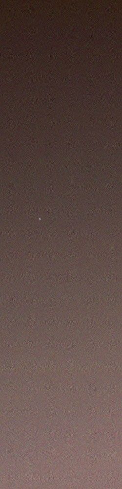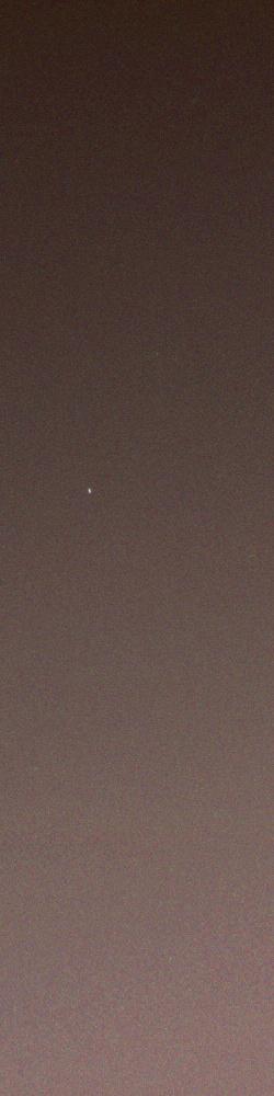 On its 449th martian day, or sol (April 29, 2005), NASA's Mars rover Opportunity woke up approximately an hour after sunset and took this picture of the fading twilight as the stars began to come out. Set against the fading red glow of the sky, the pale dot near the center of the picture is not a star, but a planet -- Earth.