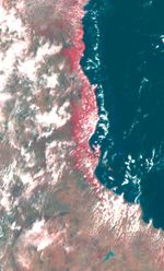 This false color image of the Eastern Coast of Australia was obtained by the Galileo spacecraft at about 3:00 p.m. PST, Dec. 8, 1990, at a range of more than 35,000 miles. The color composite was made from images taken through the methane, red and green filters.