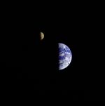 On December 16, 1992, 8 days after its encounter with Earth, the Galileo spacecraft looked back from a distance of about 6.2 million kilometers (3.9 million miles) to capture this remarkable view of the Moon in orbit about Earth. The composite photograph was constructed from images taken through visible (violet, red) and near-infrared (1.0-micron) filters. The Moon is in the foreground; its orbital path is from left to right. Brightly colored Earth contrasts strongly with the Moon, which reacts only about one-third as much sunlight as our world. To improve the visibility of both bodies, contrast and color have been computer enhanced. At the bottom of Earth's disk, Antarctica is visible through clouds. The Moon's far side can also be seen. The shadowy indentation in the Moon's dawn terminator--the boundary between its dark and lit sides--is the South Pole-Aitken Basin, one of the largest and oldest lunar impact features. This feature was studied extensively by Galileo during the first Earth flyby in December 1990.