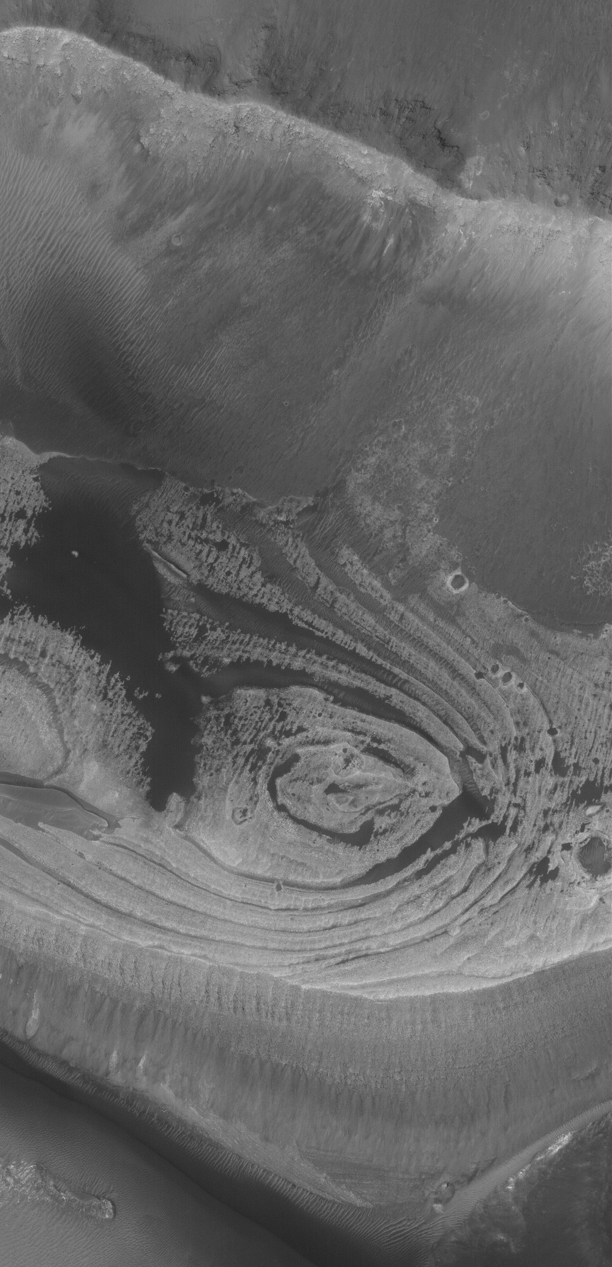 This Mars Global Surveyor (MGS) Mars Orbiter Camera (MOC) image shows light-toned, layered rock outcrops found in eastern Candor Chasma, part of the vast Valles Marineris trough system. Rocks such as these have been known to occur in the Valles Marineris since the 1971-1972 Mariner 9 mission. Whether they formed in rock that was exposed by the opening (by faulting) of the Candor Chasma trough, or formed in the trough after it was formed, is a matter of on-going debate and discussion within the Mars science community.