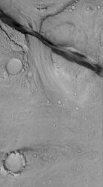 This Mars Global Surveyor (MGS) Mars Orbiter Camera (MOC) image shows a landscape in the eastern Cerberus region that was scoured by catastrophic floods, and later cut by a deep, dark-walled trough. The trough is radial to the Elysium volcanic region, and formed along faults in the bedrock.