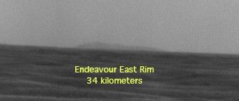 That portion of Endeavour's rim is about 34 kilometers (21 miles) away from Opportunity's position west of the crater when the image was taken. The width of the image covers approximately one degree of the horizon.