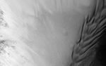 Dunes located in the center left show slip faces on the downhill side and aligned with the local gradient, indicating down slope transport (see subimage, white arrow). These "falling dunes" are a type of topographically-controlled sand dune that formed when down-slope winds were focused by the gully topography. Although rare across Mars, eastern Coprates Chasma has an abundance of these falling dunes, particularly on north-facing walls.