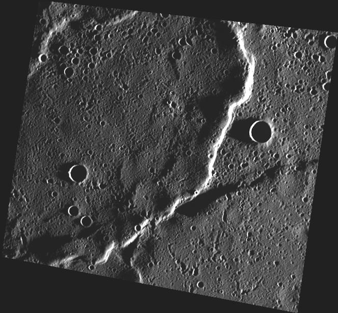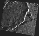 This image, taken with the Wide Angle Camera (WAC), shows a lava flow front in Mercury's northern volcanic plains region. The flow front is quite long, indicating that large volumes of highly fluid lava erupted quickly and covered large areas to form the mercurian smooth plains.