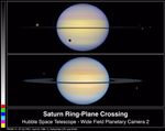 Astronomers also are studying the unusual appearance of Saturn's rings. The bottom image displays a faint, narrow ring, the F-ring just outside the main ring, which normally is invisible from Earth. Close to the edge of Saturn's disk, the front section of rings seem brighter and more yellow than the back due to the additional lumination by yellowish Saturn.