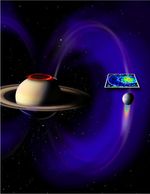 This artist's concept shows a glowing patch of ultraviolet light near Saturn's north pole that occurs at the "footprint" of the magnetic connection between Saturn and its moon Enceladus. The footprint and magnetic field lines are not visible to the naked eye, but were detected by the ultraviolet imaging spectrograph and the fields and particles instruments on NASA's Cassini spacecraft. The footprint, newly discovered by Cassini, marks the presence of an electrical circuit that connects Saturn with Enceladus and accelerates electrons and ions along the magnetic field lines. In this image, the footprint is in the white box marked on Saturn, with the magnetic field lines in white and purple.