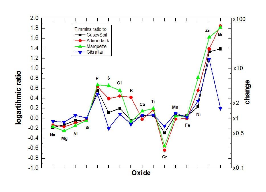 The comparison targets are soil in Gusev crater, examined by Spirit; the relatively fresh basaltic rock Adirondack, examined by Spirit; the stony meteorite Marquette examined by Opportunity; and Gibraltar, an example of sulfate-rich bedrock examined by Opportunity. The target area on Tisdale 2, called "Timmins 1," contains elevated levels of bromine (Br), zinc (Zn), phosphorus (P), sulfur (S) and chlorine (Cl) relative to the non-sulfate-rich comparison rocks, and high levels of zinc and phosphorus relative to Gibraltar.
