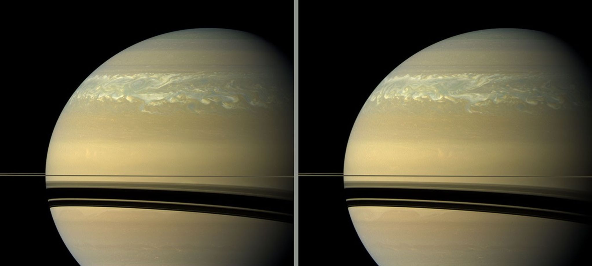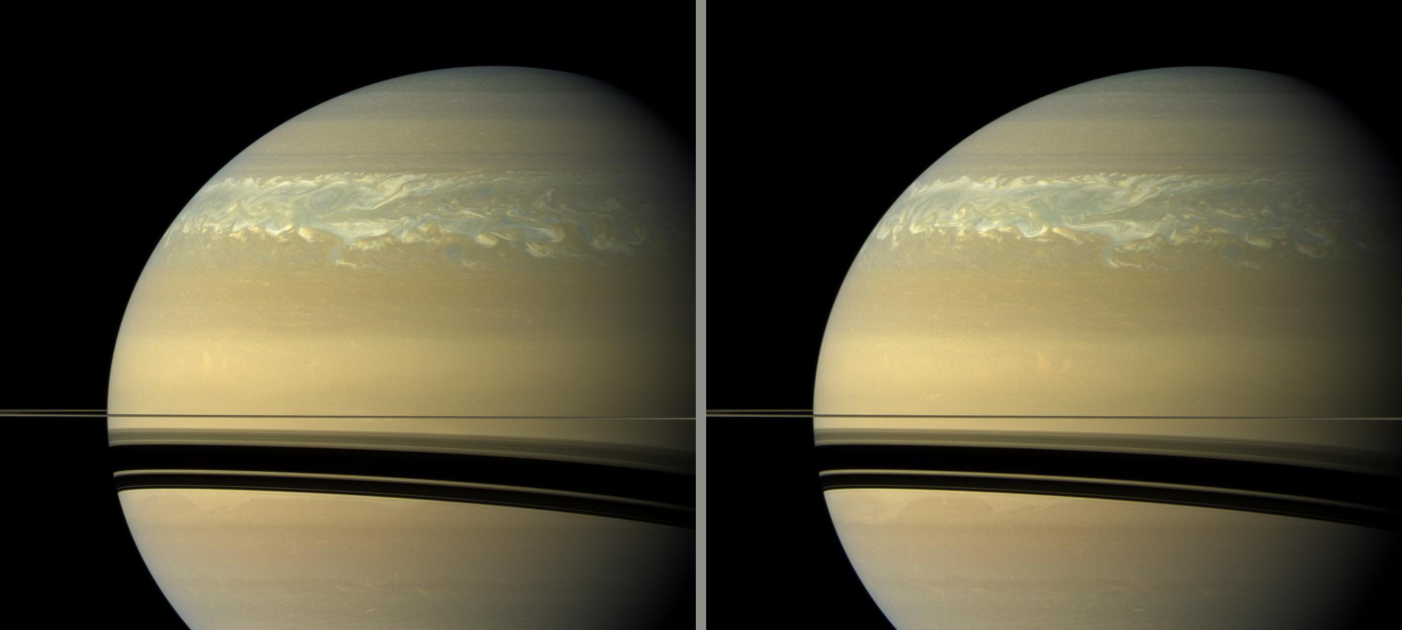 The view on the left is earlier than the view on the right. Scientists use these time-lapse images to track specific, small and sometimes subtle features in the clouds. The smallest features visible in the image are the most useful. However, tracking the clouds in this storm is difficult because the features don't always last one Saturn day.