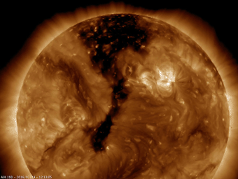 A long coronal hole has rotated so that was temporarily facing right towards Earth (Mar. 23-25, 2016). Coronal holes appear dark when viewed in some wavelengths of extreme ultraviolet light. These holes are magnetically open areas from which high-speed solar wind streams into space. This solar wind can cause aurora when it reaches Earth several days from now. So, those in higher latitudes might want to keep an eye out for some beautiful displays.