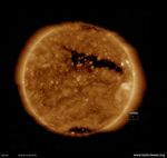 Over the past week, the single, largest feature on the sun was a long coronal hole that stretched out across more than half the diameter of the sun (Mar. 13-15, 2018). Coronal holes appear dark in certain wavelengths of extreme ultraviolet light like the one you see here. They are areas of open magnetic fields from which solar wind rushes out into space. This area likely generated the beautiful aurora that were reportedly observed on March 14th in regions near Earth's poles. With the Earth set in the image to show scale, you get a good sense of just how extensive this hole is.