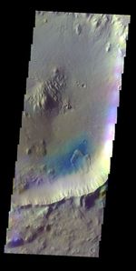 The THEMIS VIS camera contains 5 filters. The data from different filters can be combined in multiple ways to create a false color image. These false color images may reveal subtle variations of the surface not easily identified in a single band image. Today's false color image shows an unnamed crater in Elysium Planitia.