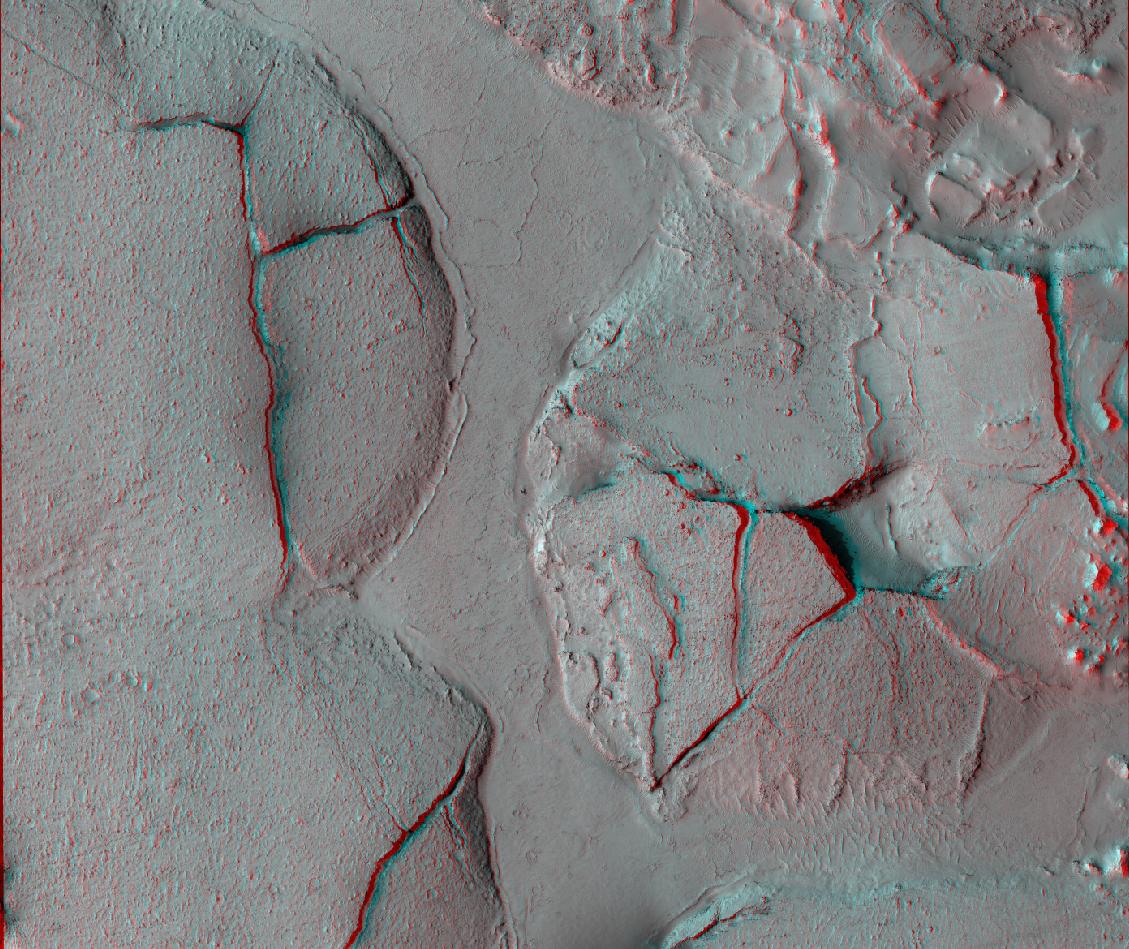 This stereo view shows fractured mounds on the southern edge of Elysium Planitia on Mars. It combines two images taken by the High Resolution Imaging Science Experiment (HiRISE) camera on NASA's Mars Reconnaissance Orbiter. When seen through red-blue glasses, the view appears three dimensional.