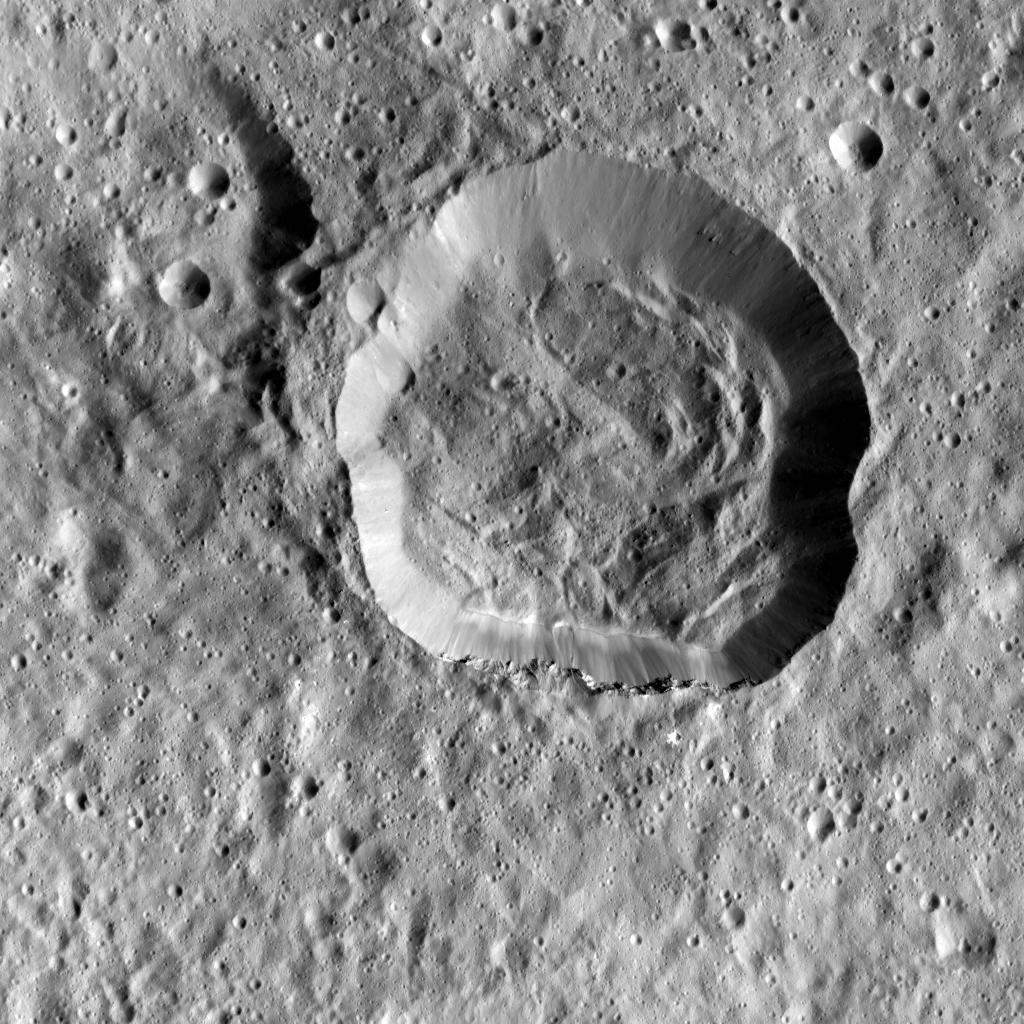 This image taken by NASA's Dawn spacecraft shows Emesh, a crater on Ceres. Emesh, named after the Sumerian god of vegetation and agriculture, is 12 miles (20 kilometers) wide. Located at the edge of the Vendimia Planitia, the floor of this crater is asymmetrical with terraces distributed along the eastern rim.