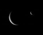 Rhea and Enceladus shared the sky just before the smaller moon passed behind its larger, cratered sibling.