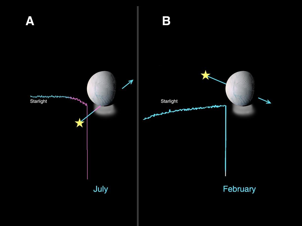 Enceladus' atmosphere is localized, not global in extent. As Bellatrix re-emerged from behind Enceladus, there was no dimming of the starlight observed. An occultation of the star Lambda Scorpius in February also showed no sign of an atmosphere, as illustrated in figure B. In figure A and B, the arrow marks the path of the star as it was blocked from view by Enceladus. In figure A, the dimming of the starlight shows as a gradual decrease in brightness, while in figure B the starlight drops abruptly just at the point in time that the star goes behind Enceladus.