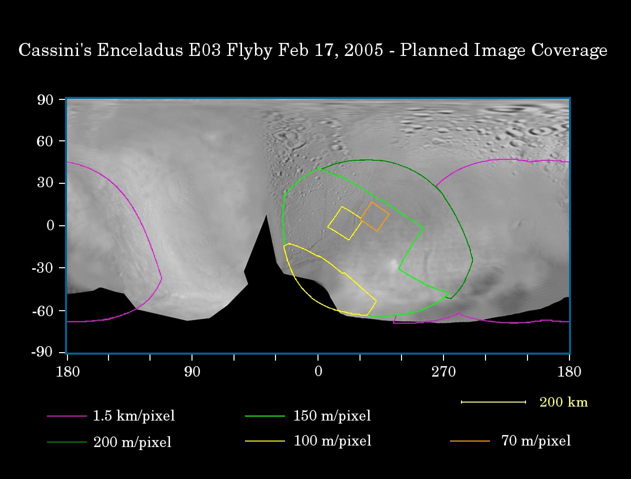 This map of the surface of Saturn's moon Enceladus illustrates the regions that will be imaged by Cassini during the spacecraft's first very close flyby of the moon on Feb. 17, 2005. At closest approach, the spacecraft is expected to pass approximately 1,180 kilometers (733 miles) above the moon's surface. Enceladus is 505 kilometers (314 miles) across.