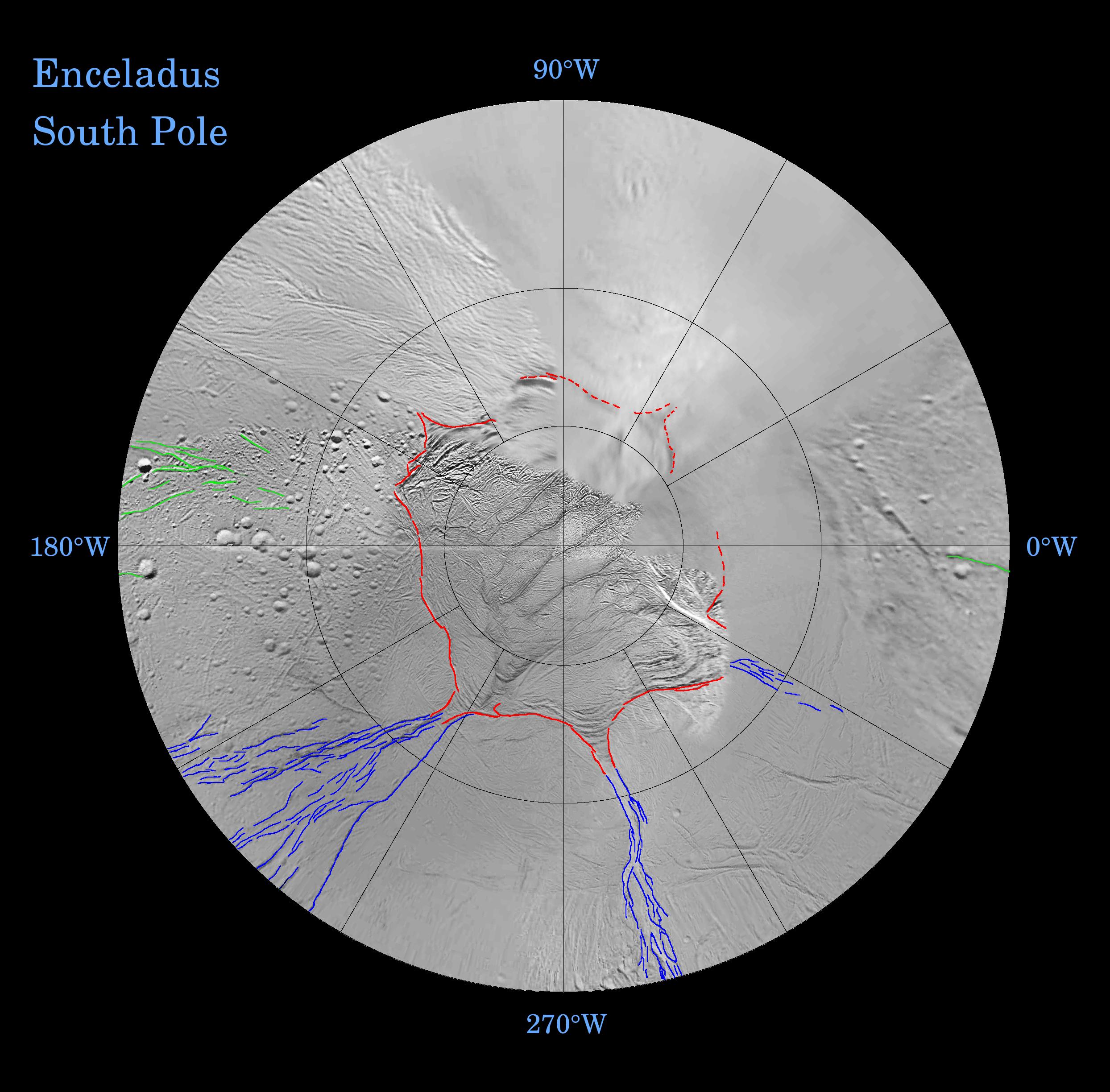 Fractures on the surface of Enceladus record a long and complex history of tectonic activity. This map is a polar stereographic projection that was mosaicked from the best-available NASA Cassini and Voyager clear-filter images.