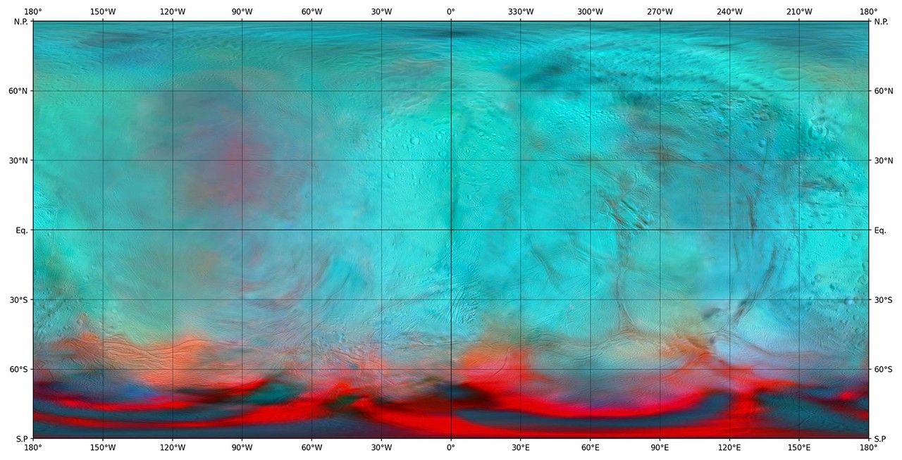It combines infrared maps obtained by the spacecraft's Visual and Infrared Mapping Spectrometer (VIMS), published by Robidel et al. (2020), and the visible map from the Imaging Science Subsystem (ISS), published by Bland et al. (2018).