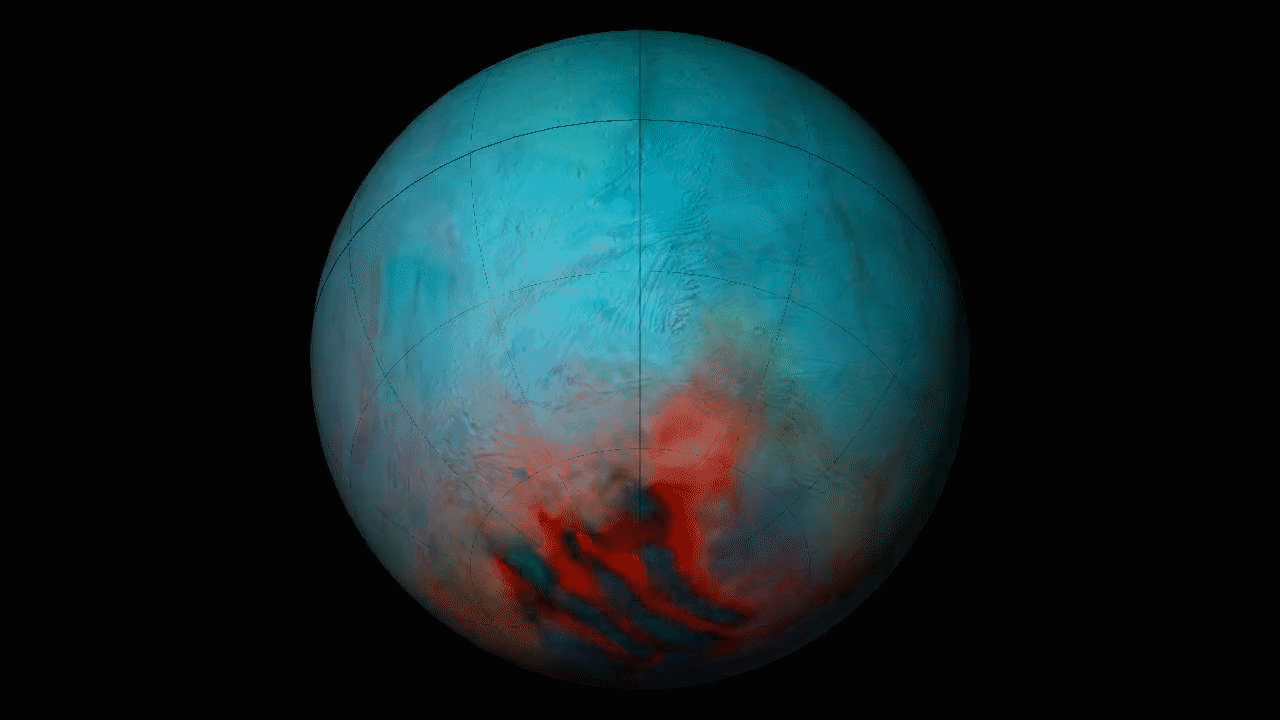 But some of the same infrared features are also seen in the northern hemisphere. That tells scientists not just that the northern area is covered with fresh ice but that the same kind of geologic activity, a resurfacing of the landscape, has occurred in both hemispheres. The resurfacing in the north may be due to icy jets, or a more gradual movement of ice through fractures in the crust, from the subsurface ocean to the surface.