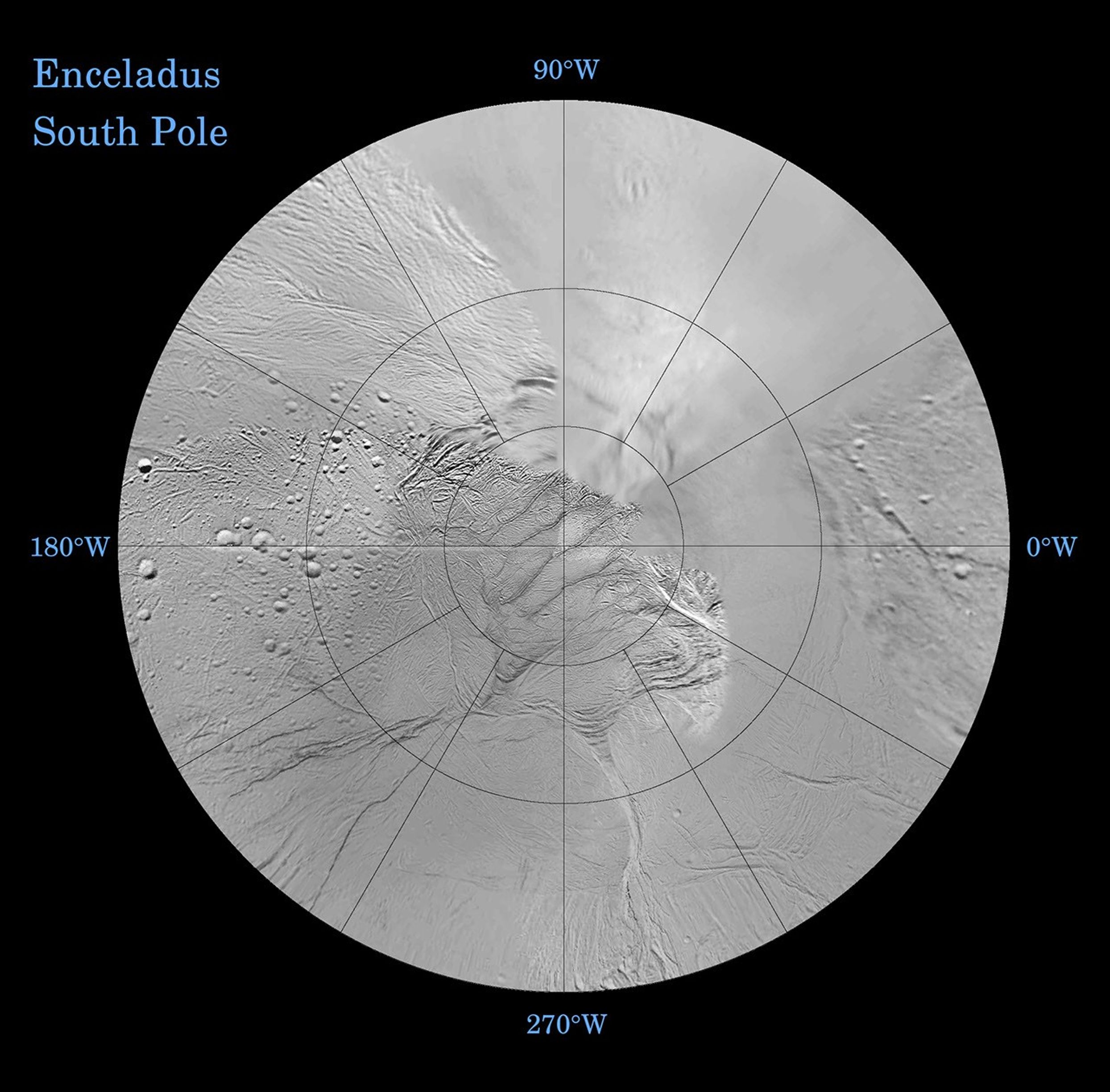 As seen in this southern hemisphere map, the band of cratered terrain at 0 and 180 degrees longitude extends southward from the equator. However, poleward of about 55 degrees south latitude, the cratered terrain is interrupted and replaced by a conspicuously fractured terrain around the pole that is nearly devoid of impact craters. In contrast to the very old north polar terrain, the southern polar terrain is among the youngest on the surface of Enceladus.