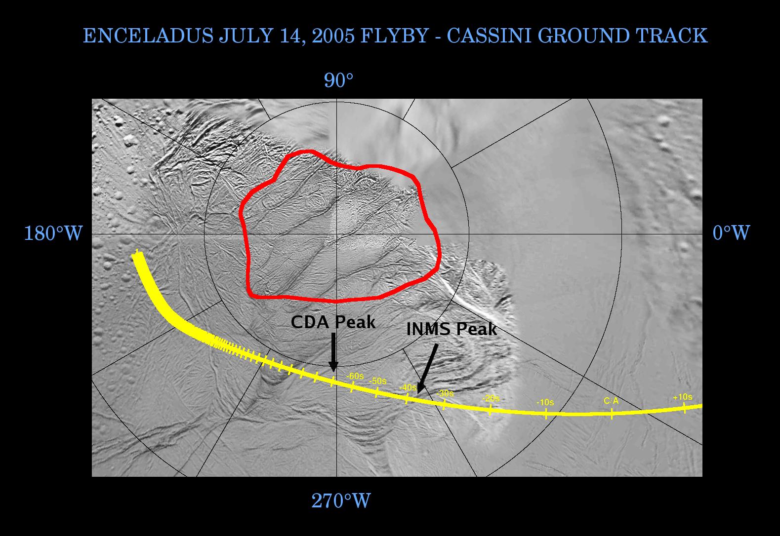This graphic shows NASA's Cassini spacecraft's path, or ground track, as it crossed over the surface of Enceladus near the time of closest approach during the flyby on July 14, 2005.