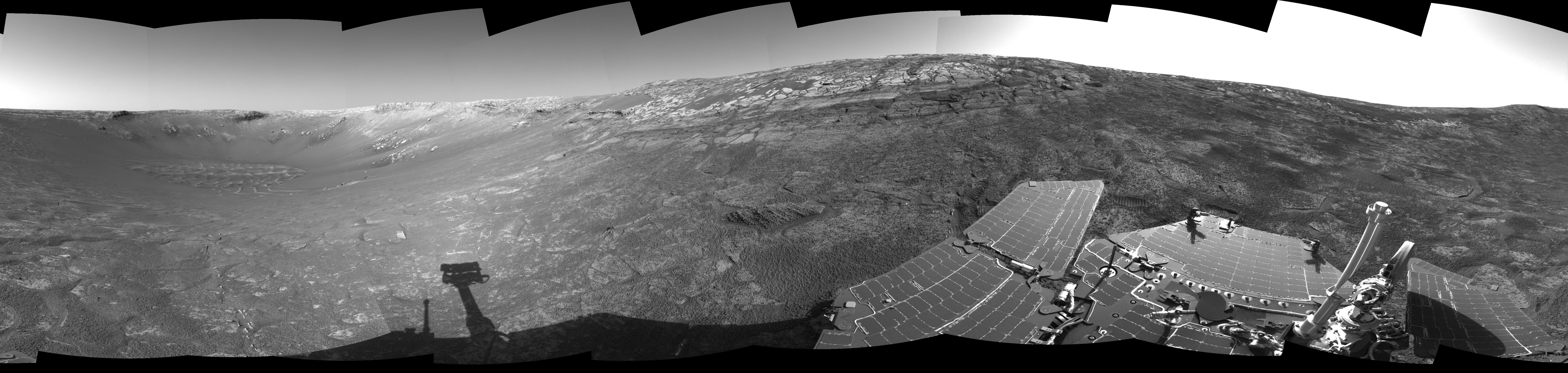 This 360-degree view of the terrain surrounding NASA's Mars Exploration Rover Opportunity was taken on the rover's 171st sol on Mars (July 17, 2004). It was assembled from images taken by the rover's navigation camera at a position referred to as "site 33." Opportunity had driven 11 meters (36 feet) into "Endurance Crater." The view is a cylindrical projection with geometrical seam correction.