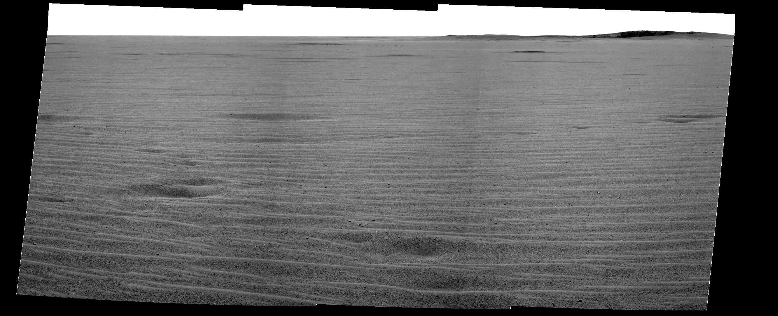 The plains appear to be uniform in character from the rovers current position all the way to Endurance Crater. Granules of various sizes blanket the plains. Spherical granules fancifully called blueberries are present some intact and some broken. Larger granules pave the surface, while smaller grains, including broken blueberries, form small dunes. Randomly distributed 1-centimeter (0.4 inch) sized pebbles (as seen just left of center in the foreground of the image) make up a third type of feature on the plains. The pebbles' composition remains to be determined. Scientists plan to examine these in the coming sols.