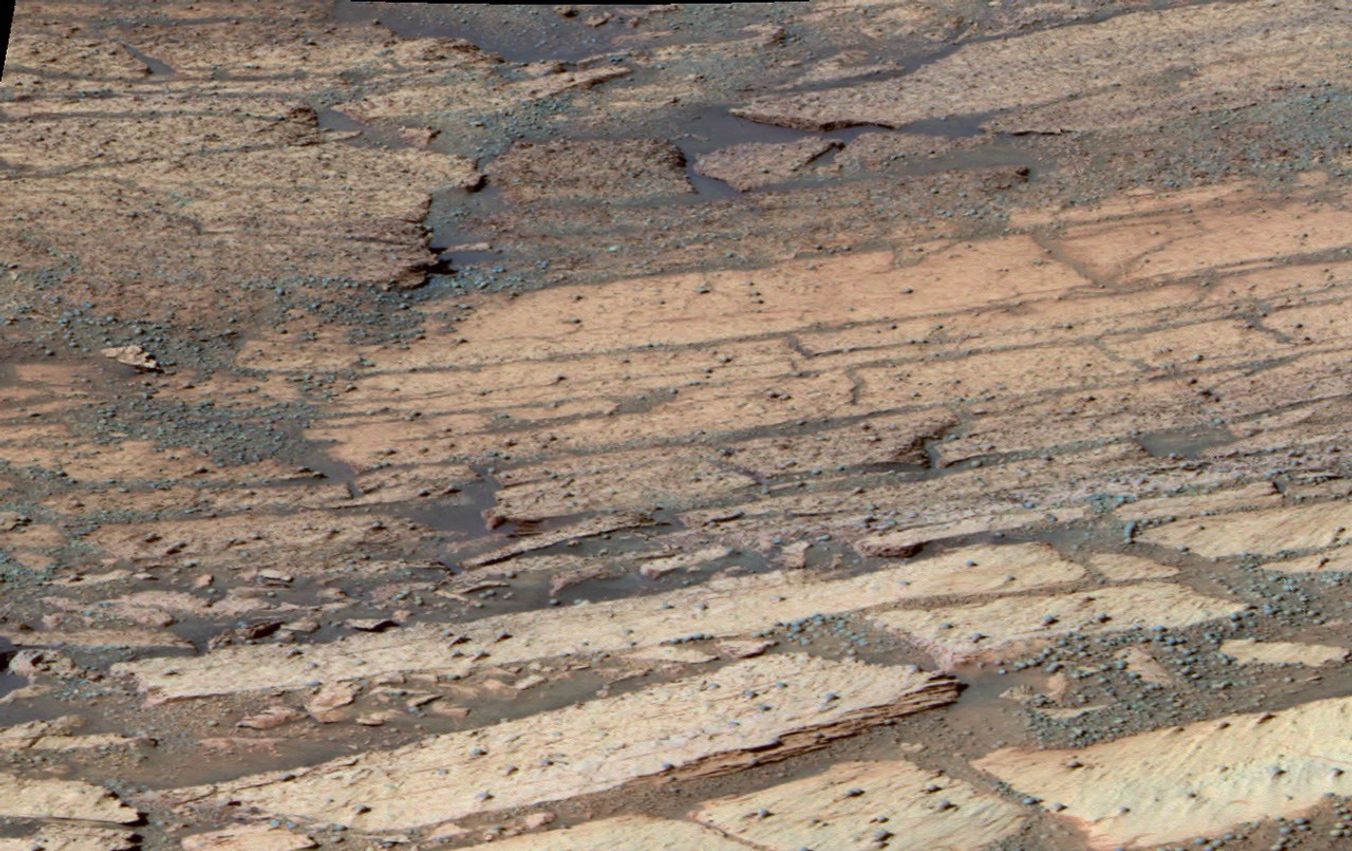 This false-color image shows the area inside "Endurance Crater" that the Mars Exploration Rover Opportunity has been examining. The rover is currently investigating the distinct layers of rock that make up this region. Each layer is defined by subtle color and texture variations and represents a separate chapter in Mars' history. The deeper the layer, the farther back in time the rocks were formed. Scientists are "reading" this history book by systematically studying each layer with the rover's scientific instruments. So far, data from the rover indicates that the top layers are sulfate-rich, like the rocks observed in "Eagle Crater." This image was taken on sol 134 (June 9, 2004) by Opportunity's panoramic camera with the 750-, 530- and 430-nanometer filters.