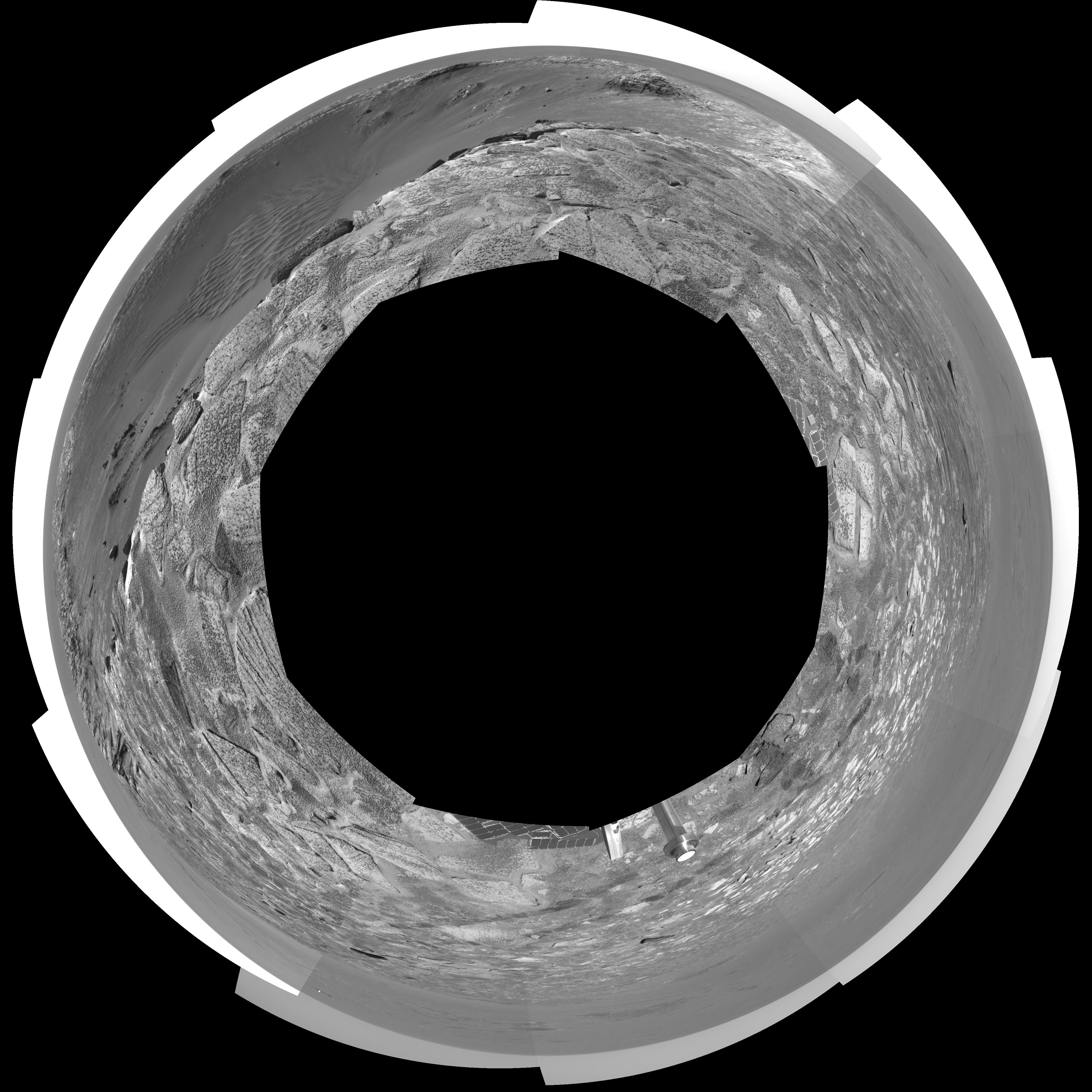 This navigation camera mosaic, created from images taken by NASA's Mars Exploration Rover Opportunity on sols 115 and 116 (May 21 and 22, 2004) provides a dramatic view of "Endurance Crater." The rover engineering team carefully plotted the safest path into the football field-sized crater, eventually easing the rover down the slopes around sol 130 (June 12, 2004). To the upper left of the crater sits the rover's protective heatshield, which sheltered Opportunity as it passed through the martian atmosphere. The 360-degree view is presented in a polar projection, with geometric and radiometric seam correction.