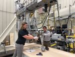 Engineers at NASA's Jet Propulsion Laboratory – from left, Matthew Cameron-Hooper, and Thomas Reynoso – prepare flight-like landing gear in the Europa Lander landing gear testbed in summer 2022.