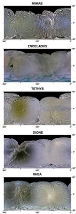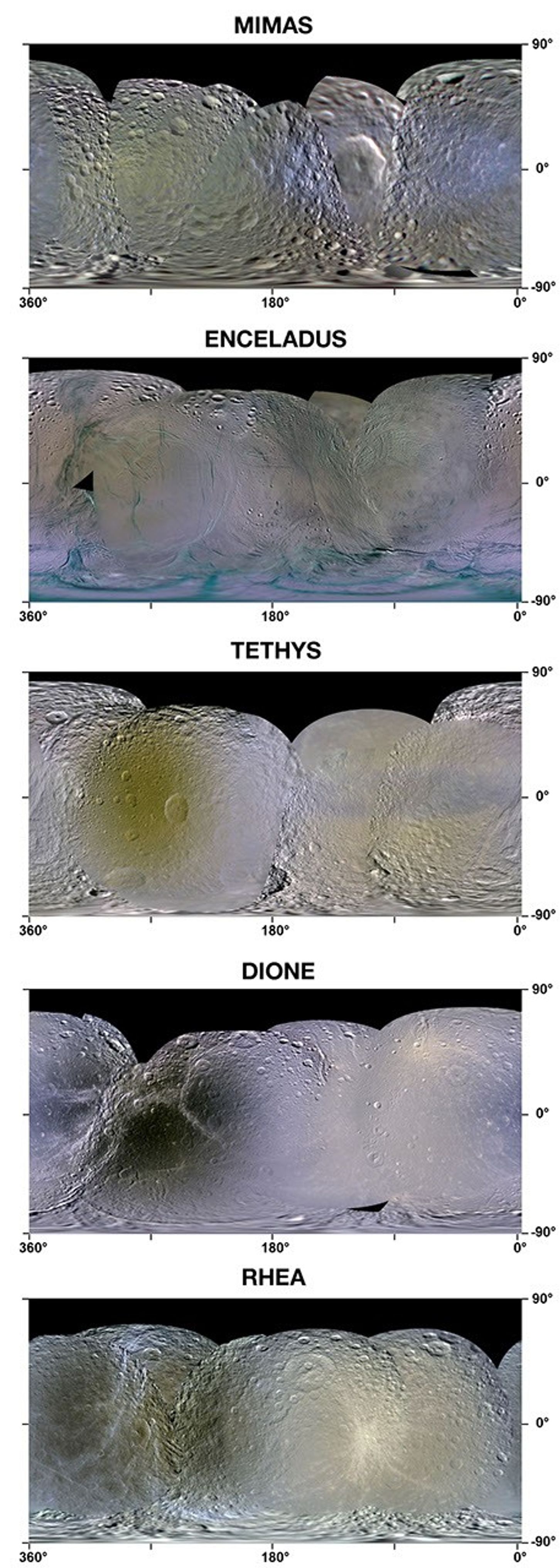 This set of enhanced-color maps made from data obtained by NASA's Cassini spacecraft show Saturn's moons Mimas, Enceladus, Tethys, Dione and Rhea. The global maps show the colorful splotches and bands on the icy moons' surfaces that scientists believe came from bombardments large and small.