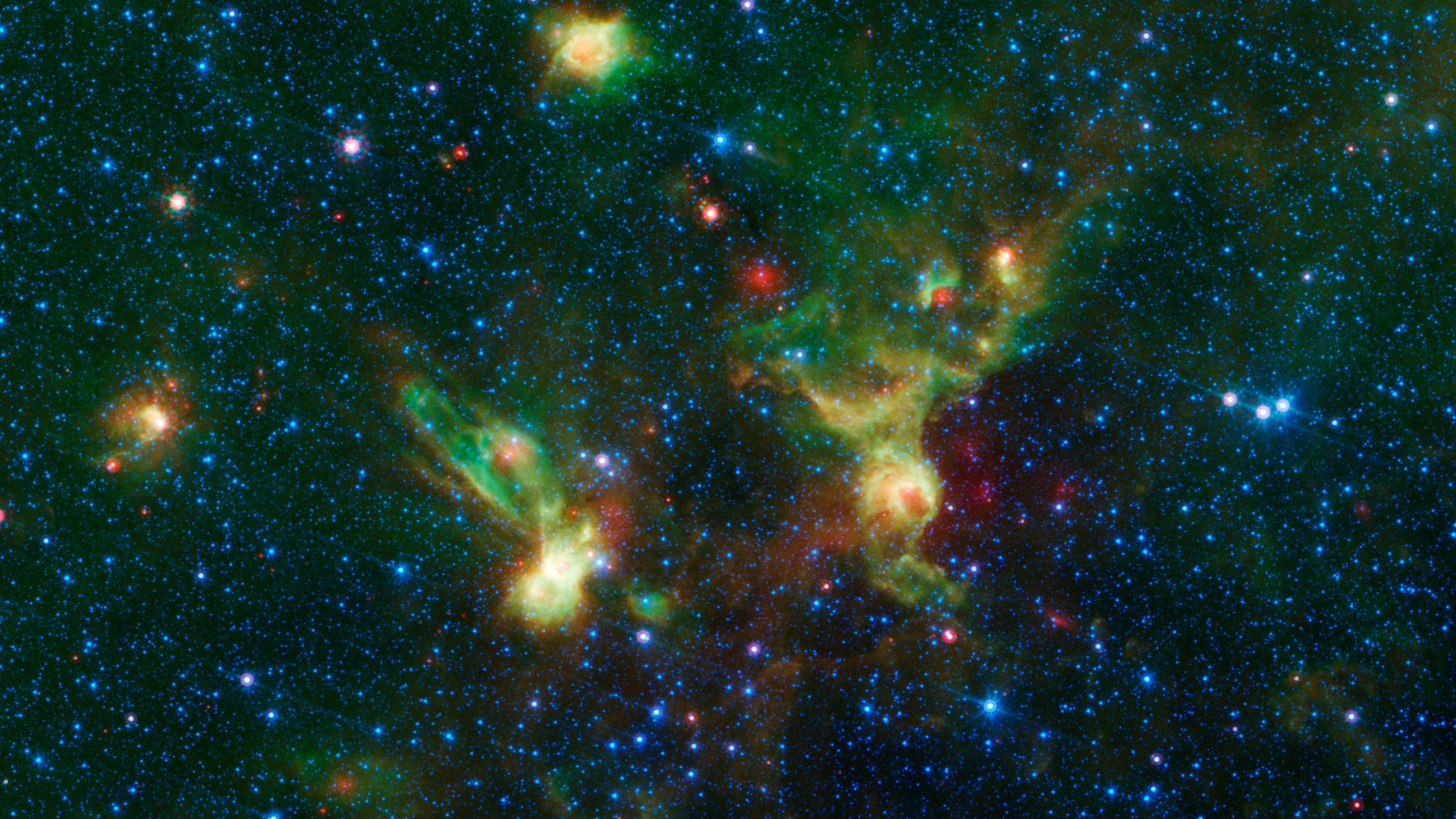 Astronomically speaking, the region pictured here falls within the disk of our Milky Way galaxy, and displays two regions of star formation that are hidden behind a haze of dust when viewed in visible light. Spitzer's ability to peer deeper into dust clouds has revealed a myriad of stellar birthplaces like these, which are officially known only by their catalog numbers, IRAS 19340+2016 and IRAS19343+2026.