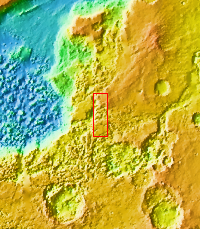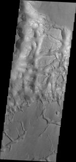Today's VIS image shows part of the mesa and valley terrain called "chaos." This region of chaos is near the far eastern end of Valles Marineris.