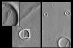 Images from the Mars Global Surveyor (MGS) Mars Orbiter Camera (MOC) dramatically illustrate that many places on the red planet have outcrops of layered geologic materials. The two pictures above show the remains of layered material inside craters in southwestern Utopia Planitia (see inset for detailed view). These remnant layers indicate that the craters--and perhaps the plains that surround them--were once buried beneath a deposit that has since been eroded away. This theme of layered outcrops and exhumed craters appears to be one of the dominant observations that MGS MOC has made--to date--about Mars. The origin and composition of the layered material--and its ultimate fate once it was largely eroded away--are unknown.