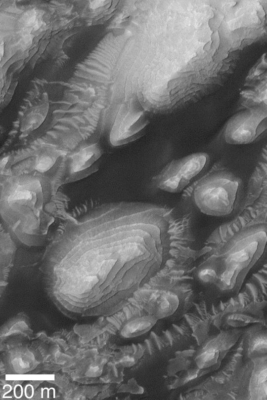 This high resolution Mars Global Surveyor (MGS) Mars Orbiter Camera (MOC) image shows eroded, layered sedimentary rock exposures in an unnamed western Arabia Terra crater at 8°N, 7°W. The dark material is windblown sand; much of the erosion of these layers may have also been caused by wind. Sunlight illuminates the scene from the left.