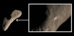 As the NEAR Shoemaker spacecraft descends into lower orbits around Eros, it continually returns higher spatial resolution images of the asteroid. The true color image at left was taken February 12, 2000, from a range of 1,748 kilometers (1,083 miles), and shows details only as small as 180 meters (590 feet) across. It was taken two days before orbit insertion, as part of an image sequence designed to provide moderate-resolution color mapping of Eros at a near-constant viewing geometry. The true color image inset at right was taken February 29 from a range of 283 kilometers (175 miles) and shows much smaller details only 27 meters (89 feet) across. The higher spatial resolution (by a factor of six) brings out a whole class of surface details that were either invisible or at the margin of visibility in the earlier images. For example, the bright material on the wall of the large crater in the inset image is barely evident in the lower-resolution image at left, but by virtue of its limited spatial coverage the inset image lacks information on the crater's regional geologic setting. NEAR Shoemaker's imaging strategy makes use of both types of images, with lower-resolution images providing "context" for higher-resolution images that bring specific features into sharper focus.