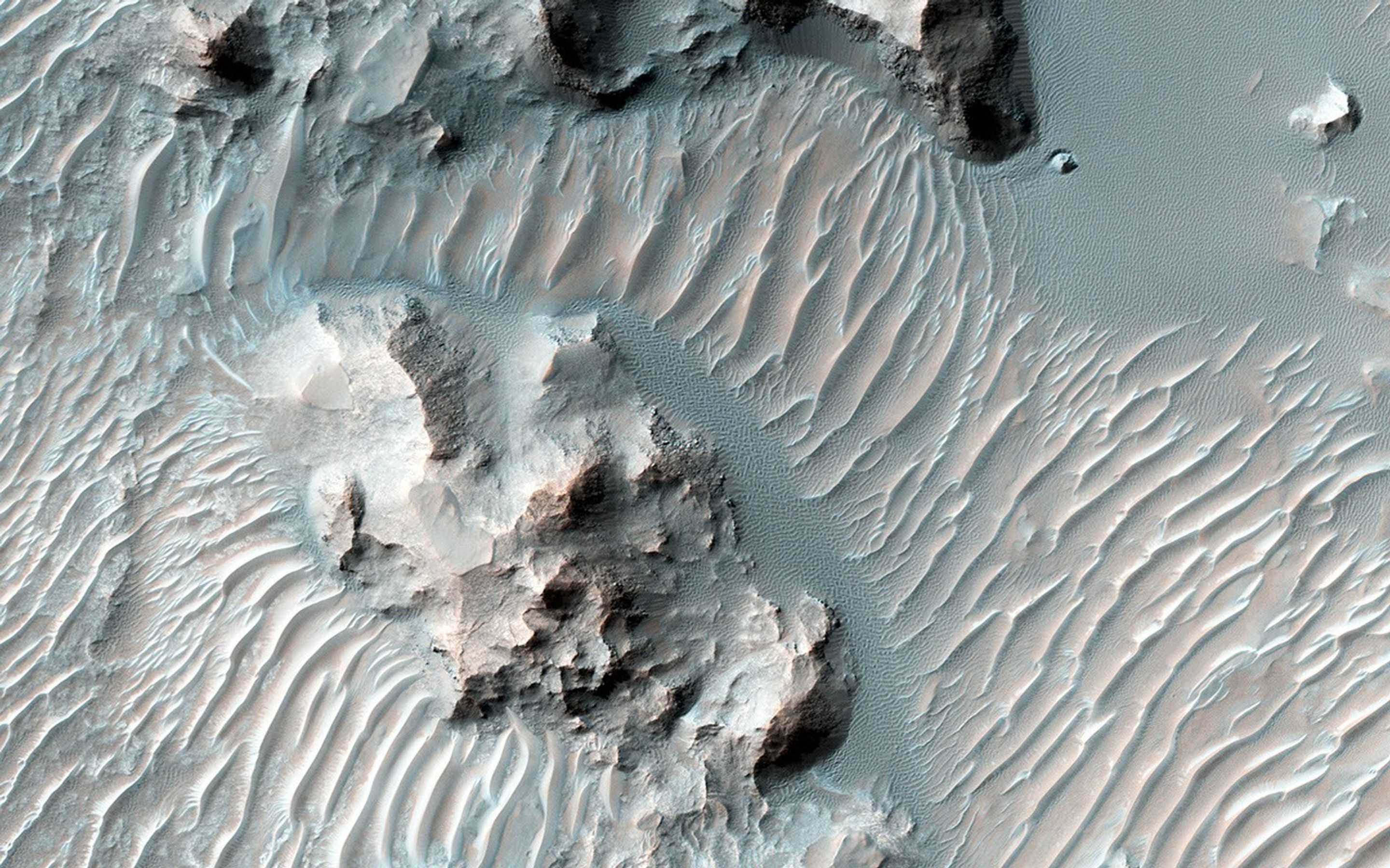 More of the TAR are visible in another closeup image. In this case, they are clearly covered by a dark, ripple-covered sand sheet. We have only imaged this location once, so it is impossible to determine whether or not the sand sheet is blowing in the wind. But due to repeated HiRISE imaging in other areas, active dunes are now known to be common across Mars and we can reasonably speculate that these dunes are moving, too.