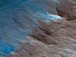 The slope appears to be eroding from a combination of landslides, block falls, and sublimation. The bright icy exposure in the larger landslide scar (upper right) suggests that this was a relatively recent event.