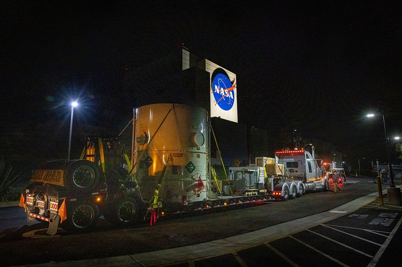 The main body of NASA's Europa Clipper spacecraft is seen in its shipping container as it rolls into the agency's Jet Propulsion Laboratory in Southern California. Over the next two years, engineers and technicians will finish assembling the craft by hand. Then it will be tested to make sure it can withstand the journey to Jupiter's icy moon Europa.
