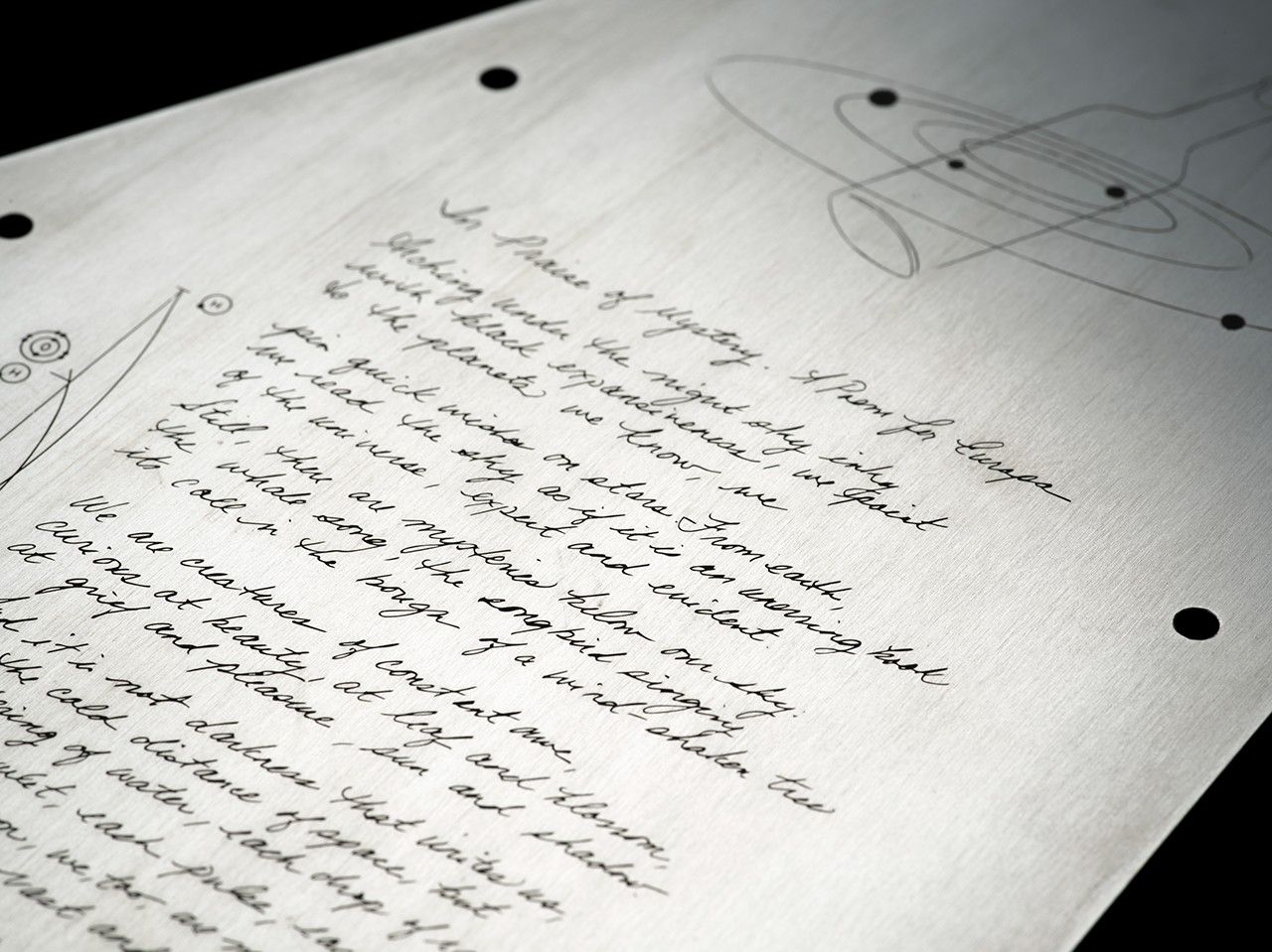 A commemorative plate mounted on NASA's Europa Clipper spacecraft features U.S. Poet Laureate Ada Limón's handwritten In Praise of Mystery: A Poem for Europa. It will be affixed with a silicon microchip stenciled with names submitted by the public.