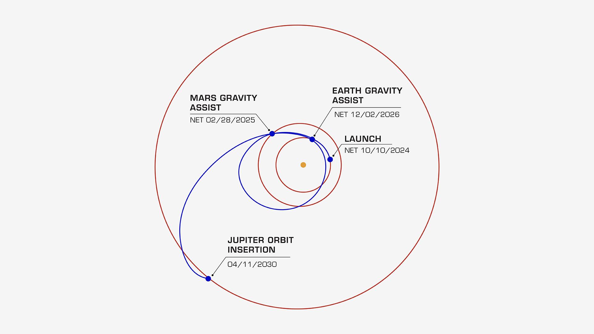 On its journey to the Jupiter system, NASA's Europa Clipper will take a path that swings past Mars, then Earth, using the gravity of each planet as a slingshot to boost the spacecraft's speed. All told, the journey will take about 5½ years, covering a distance of about 1.8 billion miles (2.9 billion kilometers). In this diagram, the orbits of Jupiter, Mars, and Earth are shown as concentric rings. Europa Clipper launched on Oct. 14, 2024 and was set to fly by Mars on March 1, 2025. The Earth gravity assist maneuver is set for Dec. 3, 2026. The spacecraft is scheduled to begin orbiting Jupiter on April 11, 2030. Then it will begin its investigation of the gas giant's icy moon Europa.