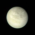 View of Europa taken from a range of 2,869,252 kilometers (1.6 million miles) on March 2 at 2:00 PM. The color composite is made from three black and white images taken through the orange, green and violet filters. The 170 longitude is at the center of the picture; this is the face away from Jupiter. Irregular dark and bright patches on the surface are different from the patterns on the other satellites of Jupiter and those on the Moon, Mars and Mercury. Dark intersecting lines may be faults that break the crust. JPL manages and controls the Voyager Project for NASA's Office of Space Science.