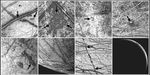 7. This long lineament, Rhadamanthys Linea. is spotted with dark "freckles." Are these freckle features formed by icy volcanism? Is this an early form of a triple band? Stereo and high resolution (to 46 meters per picture element) obtained during Galileo's eighteenth orbit of Jupiter may indicate whether the lineament is the result of volcanic processes or is formed by other surface processes.