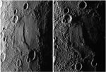 The above MESSENGER images were taken on approach to Mercury during the spacecraft's second (left) and third (right) flybys. The image from the second flyby was featured in an earlier release. The image on the right was taken about 75 minutes before MESSENGER's closest approach. The two images cover very nearly the same terrain, but for the right image the Sun's illumination is more nearly grazing (local time is almost sunset) and the viewing perspective of the spacecraft is more nearly vertical. The large impact crater bisected with a prominent scarp or cliff is the same feature in both images. Because of Mercury's rotation between the two encounters, the position of the crater in the right image is nearly at the terminator (the division between the dayside and night side of the planet), and thus the shadows are longer. The near-grazing illumination emphasizes the topography of the crater floor, including the relief of the wrinkle ridges on either side of the large scarp. To the west of the crater, the shadows and viewing angle show that the terrain is far more rugged than it appeared from the second flyby.