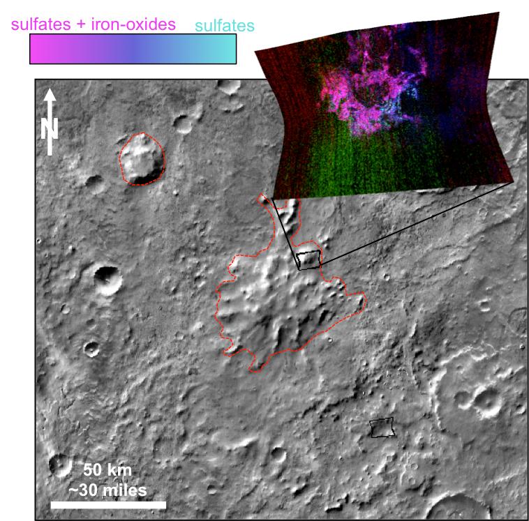 These mountains are in a region called Sisyphi Montes. In this graphic, the base image shows a portion of the region about 130 miles (230 kilometers) across, centered at 17.73 degrees east longitude, 63.46 degrees south latitude. Red outlines indicate possible subglacial volcanic structures. CRISM data are presented in the overlay box at upper right, with an indication of the ground area covered by this CRISM observation. The color key at upper left shows how the spectrometer data correspond to presence of sulfates and iron oxide minerals, which are characteristic of subglacial volcanism sites on Earth.