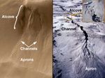 The landforms both on Earth and Mars are divided into three parts: the alcove, the channel, and the apron. Water seeps from between layers of rock on the wall of a cliff, crater, or other type of depression. The alcove forms above the site of seepage as water comes out of the ground and undermines the material from which it is seeping. The erosion of material at the site of seepage causes rock and debris on the slope above this area to collapse and slide downhill, creating the alcove.