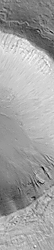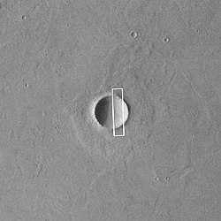 The crater is located at 36.7°N, 252.3°W. The MOC image was acquired in November 1999 and covers an area 3 km (1.9 mi) wide by 14 km (8.7 mi) long; north is toward the upper right (in A) and it is illuminated by sunlight from the lower left. The Viking 1 orbiter context image (B) was obtained in 1978 and is illuminated from the left; north is up. The MOC image has been rotated in the Explanatory Figure (C) such that north is toward the upper left, illumination is from the lower right.