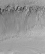 Nirgal Vallis is an ancient valley thought for nearly 3 decades to have been carved, in part, by running water at some time far back in the martian past. Today the valley is, like the rest of Mars, quite dry. However, some of the high resolution Mars Global Surveyor (MGS) Mars Orbiter Camera (MOC) images reveal small gullies on the walls of this valley system. An example is shown here (above, left), in which more than 14 channels nearly 1 kilometer (0.6 miles) long run down the south-facing slope of the Nirgal Vallis wall. Each narrow channel starts at about the same position below the top of the valley wall, indicating that there is a layer along which a liquid -- most likely, water -- has percolated until it reached the cliff, then ran down hill to form the channels and the fan-shaped aprons at the bottom of the slope. Some of the apron deposits seem to cover the dunes on the floor of the valley (lower 1/3 of the image), suggesting that the channels and aprons formed more recently than the dunes. The fact that neither the dunes nor the aprons and channels have impact craters on them suggests that these features are all geologically young, meaning a few million years at most, a few days or weeks at least.